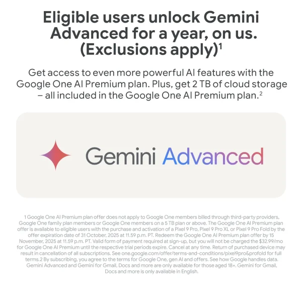 Meet Pixel 9 Pro Fold with Gemini. It’s engineered by Google and brings you the best of Google’s AI first. With a display of epic proportions, you can multitask in Split Screen and enjoy immersive entertainment.1 Snap brilliant selfies with the powerful rear camera, and use tabletop mode for hands-free pics.