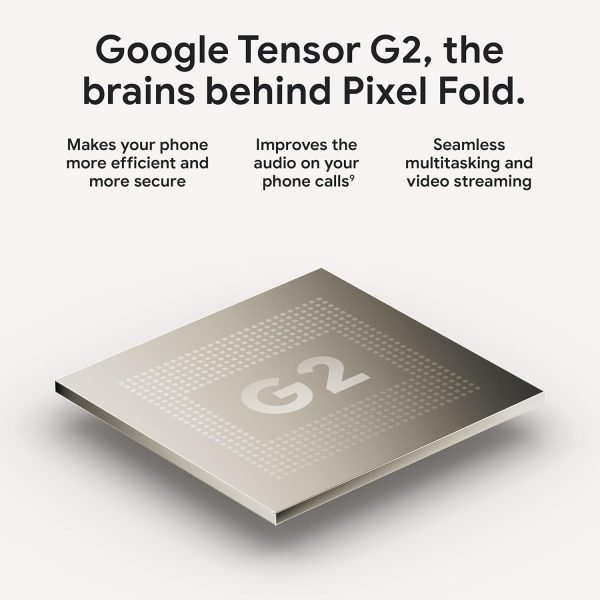 Meet Pixel Fold, the first foldable phone engineered by Google. All the power of the Google Tensor G2 chip – in a thin, pocket-size design. It’s a Pixel phone on the outside. And a big, immersive display on the inside for entertainment and multitasking. So you can do even more, in so many ways. LEGAL [1]Requires compatible apps. [2]Works with all major carriers. 5G service is carrier dependent. Requires a 5G data plan (sold separately). 5G service not available on all carrier networks or in all areas. Contact carrier for details. 5G service, speed, and performance depend on many factors, including carrier network capabilities and signal strength. Actual results may vary. Some features not available in all areas. Data rates may apply. See g.co/pixel/networkinfo for info. [3]Common Criteria certification for hardware and cryptographic library. See g.co/pixel/certifications for details. [4]Restrictions apply. Some data is not transmitted through VPN. Not available in all countries. All other Google One membership benefits sold separately. This VPN offer does not impact price or benefits of Google One subscription plan. Use of VPN may increase data costs depending on your plan. See g.co/pixel/vpn for details. [5]Face Unlock available on outer display only. [6]Designed to comply with water protection rating IPX8 under IEC standard 60529 when each device leaves the factory but the device is not waterproof. The accessories are not water resistant. Water resistance is not a permanent condition and will diminish or be lost over time due to normal wear and tear device repair. disassembly or damage. Dropping your device may result in loss of water resistance. Liquid damage voids the warranty. See g.co/pixel/water for details. [7]Watch, tablet, and earbuds sold separately. [8]Based on third-party global research firm report. Evaluation considered features that may not be available in all countries. See goo.gle/mobilesecurity2022 for more information. [9]US only. English only. Call Screen may not detect all robocalls and spam calls. [10]Your Pixel will generally receive Feature Drops during the applicable Android update and support periods for the phone. See g.co/pixel/updates for details. Availability of some Feature Drops may vary. [11]For “all day”: Estimated battery life based on testing using a median Pixel user battery usage profile across a mix of talk, data, standby, and use of other features. For “up to 72 hours”: Estimated battery life based on testing using a median Pixel user battery usage profile across a mix of talk, data, standby, and use of other features. Battery testing conducted on a major carrier network. For both claims: Battery testing conducted in California in early 2023 on pre-production hardware and software using default settings. Battery life depends upon many factors and usage of certain features will decrease battery life. Actual battery life may be lower. [12]Not available for all camera apps or modes. [13]​​Maximum resolution and field of view not available for all camera apps or modes. [14]Pixel Stand sold separately.